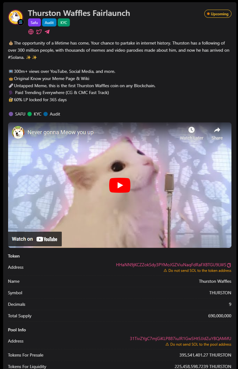 📺300m+ views over YouTube, Social Media, and more. 👑Original Know your Meme Page & Wiki 🗞Untapped Meme, this is the first Thurston Waffles coin on any Blockchain. 🗣 Paid Trending Everywhere (CG & CMC Fast Track) 🔐60% LP locked for 365 days